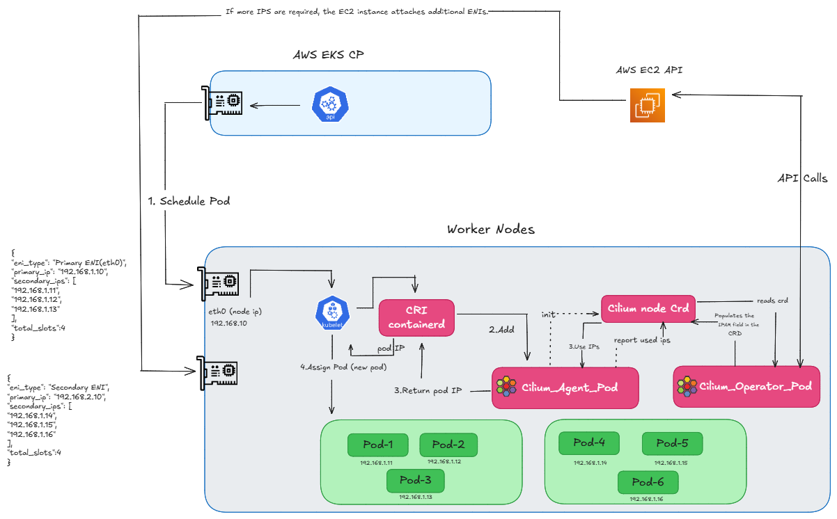 One thing is happening here: when the Cilium Operator asks for a new batch of IPs, if we don’t have enough available slots for secondary IPs on the primary ENI, EC2 automatically attaches a new ENI. So, in ENI mode, these additional Pod IPs come directly from the Secondary IPs of this newly attached ENI. Once that new ENI is attached and the IPs are available, the pending Pod is created.