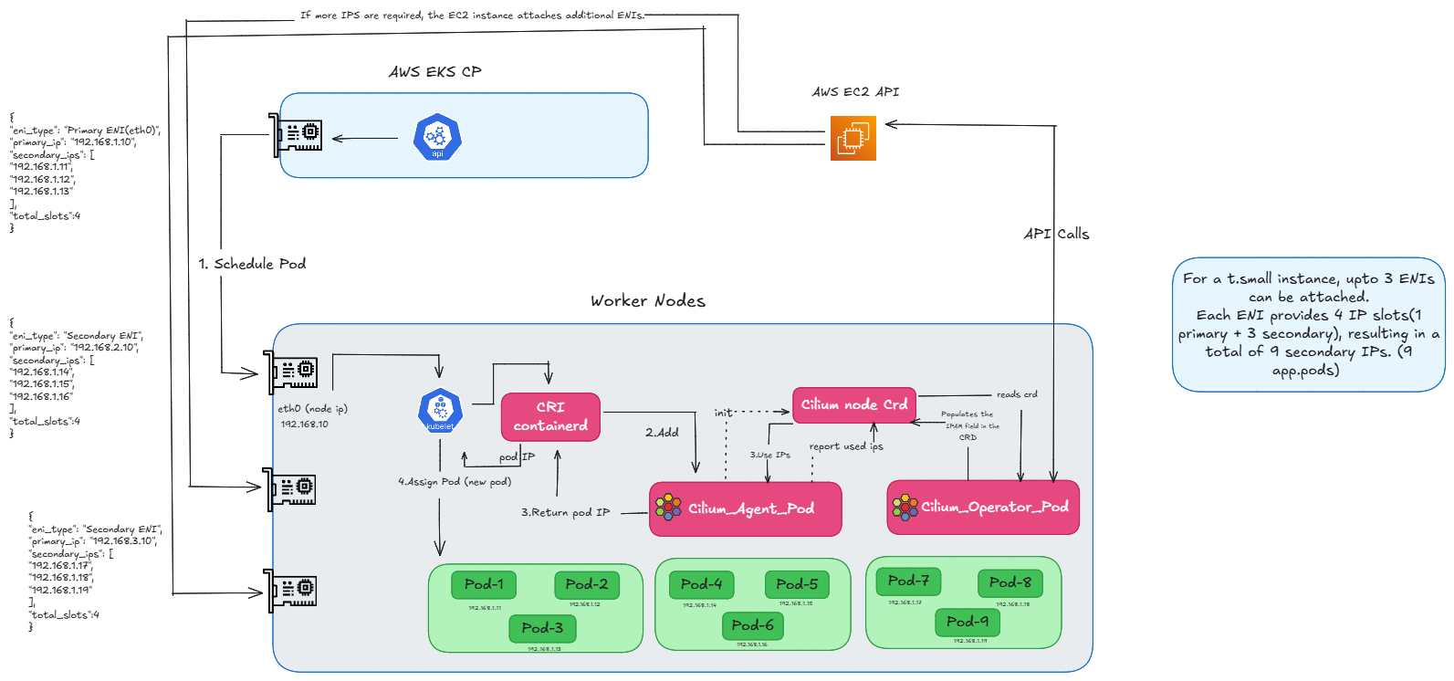 So, we can say that the CNI manages Secondary IPs for Pod IPs, and Cilium in ENI mode uses these Secondary IPs. And that is exactly what causes our limitations in ENI mode. The problem is that every EC2 instance type has a limit on how many ENIs and IPs it can use. For example, if we take a t3.small instance, it allows 3 ENIs, but each ENI only supports 4 IP slots—primary and 3 secondary—so we can have only 9 application pods. So, in the end, we can say that because of these ENI limits, the Pod count is directly limited by the physical capacity of the EC2 instance.