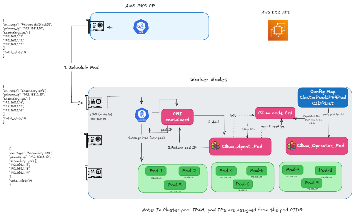To overcome this, many organizations are adopting Cilium as the primary CNI on AWS EKS with ClusterPool IPAM and overlay networking. By fully replacing the default CNI, Cilium removes dependency on ENI-based pod IP allocation, enables predictable IP management at the cluster level, and supports faster, more reliable scaling.