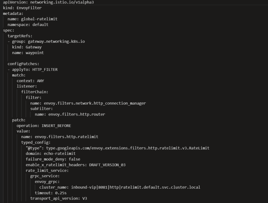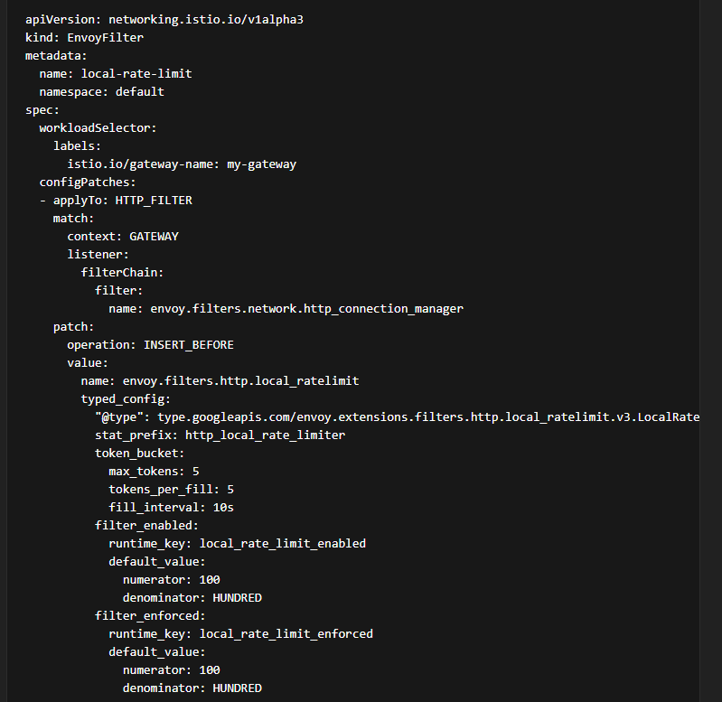 Below is an example configuration for Local Rate Limiting in Istio Ambient Mesh using an Envoy Filter attached to a Waypoint or Gateway.